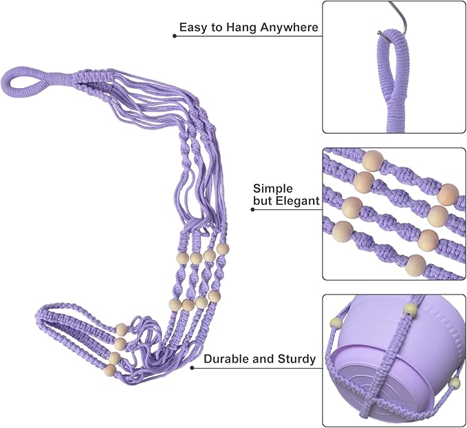Macrame Plant Hanger with Pot, 3 Set Hanging Planters for Indoor Plants, Handmade Cotton Rope Boho Home Decor, Idea Gift for Anyone, Includes Plant Holders, Pots, Plates and Hooks (Purple)