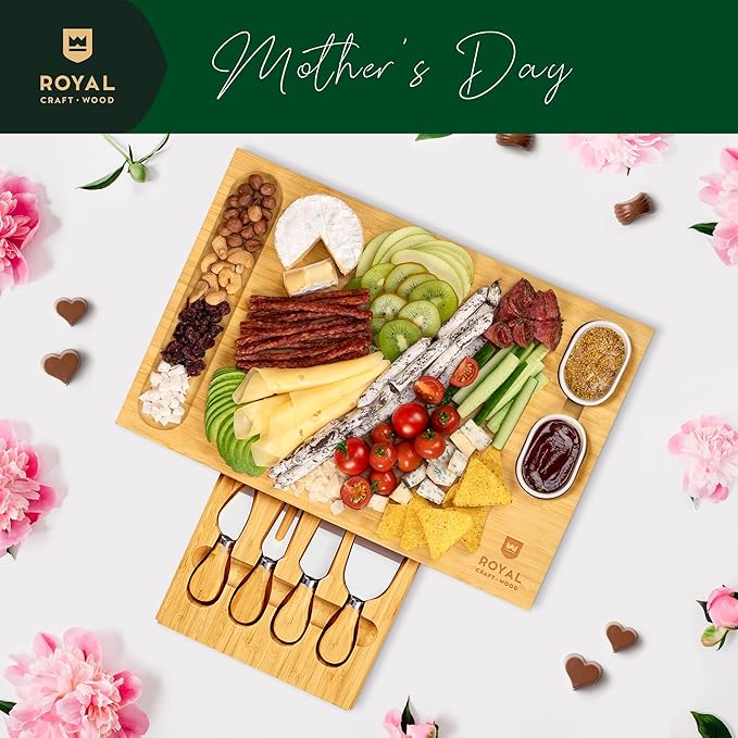 ROYAL CRAFT WOOD Bamboo Cheese Board and Knife Set with Charcuterie Board & Serving Tray with 4 Stainless Steel Knife & Thick Wooden Server with Bowls and Serveware Accessories