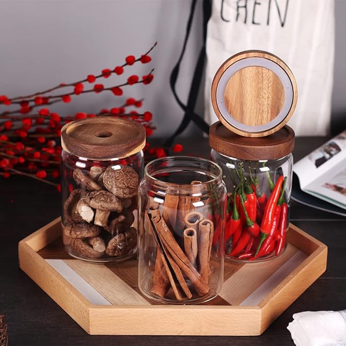 - 【MATERIAL】: This glass canister is made from clear high-grade borosilicate glass + natural acacia wood lids. Environmental friendly ,non-toxic,freezable,resistant to corrosion and high temperature.