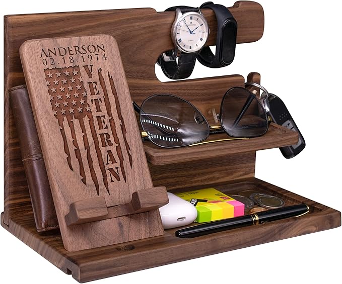 - Best Personalized Veteran Gift Choice: Give a gift that combines love and practicality. Perfectly suited as side table organizer, versatile bedside organizer for nightstand, or premium veterans day gifts, it’s a tribute that lasts. A true reminder of dedication, it belongs among the most functional mens dresser top organizer picks and elegant wooden anniversary gifts for him. From personalized wooden gifts for him to premium mens docking station, it blends décor and emotion.