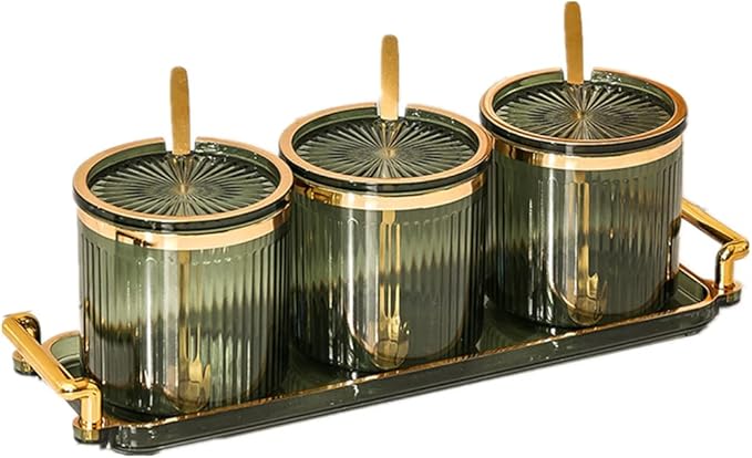 - ▲▲【Independent Jars】: The storage tank set includes 3 containers of the same size (3.34’’*3.46’’), equipped with 3 spoons(5.11’’), a tray(12.2’’*4.72’’). a jar to store a spice, an independent jar, various seasonings are clear at a glance, the kitchen is orderly and tidy, and it is convenient to press at any time. Accessible, no time wasted searching for bags for spices or knocking over spice bottles.