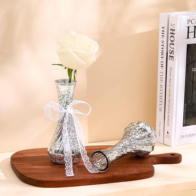 Set of 24 Glass Vase, Silver Bud Vases in Bulk Antique Style with Lace for Floral Arrangements, Events, Home Decor Weddings, Table Centerpiece