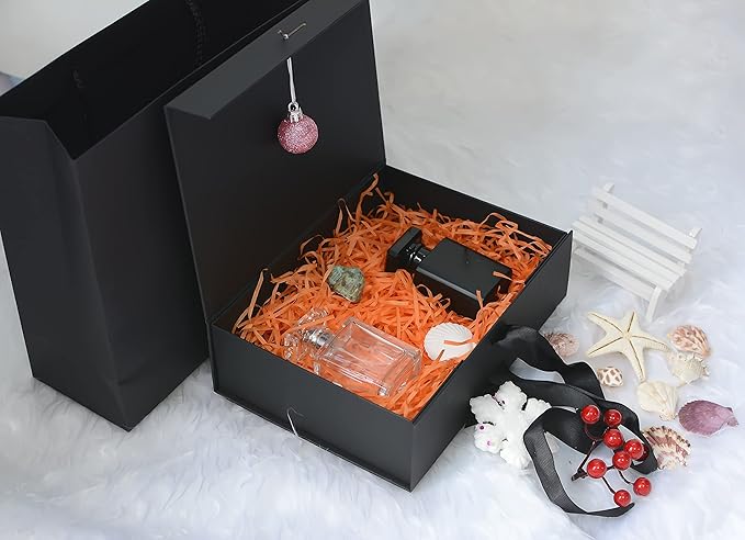 Large Black Luxury Magnetic Gift Box with Lid, Ribbons and Gift Bag, 12.2x8.7x4 Inches, Great for Christmas, New Year, Wedding, Birthdays, Man