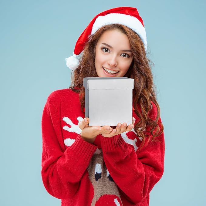 - MULTIPURPOSE STORAGE ORGANIZER BOXES. Set of 5. Metallic Silver Finish, High shine, square shape with lid, stackable nesting gift box tower. Size range from Xlarge to Xmall, 7.1'', 6.7'', 5.5'', 4.7'' and 4 Inch. Heavy-duty, 300g paper card stock boxes, great for any small to mediums gifts like books, candles, jewelry, cosmetics, small toys, home decor, apparel, scarf, and candies.