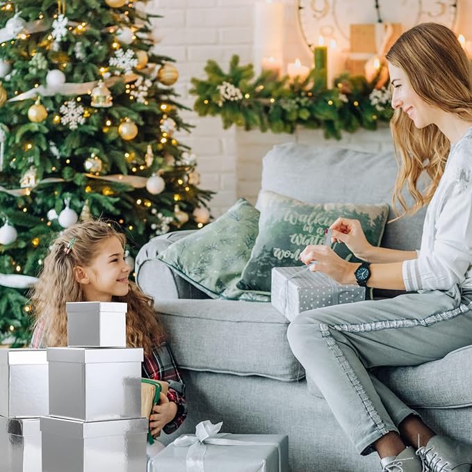 UNIQOOO 5Pcs Metallic Silver Christmas Gift Box Set with Lid, Assorted Size, Silver Square Nested Wedding Keepsake Card Gift Box, Paper Box Tower Organizer For Party, Thanksgiving, Gift Wrap Packaging