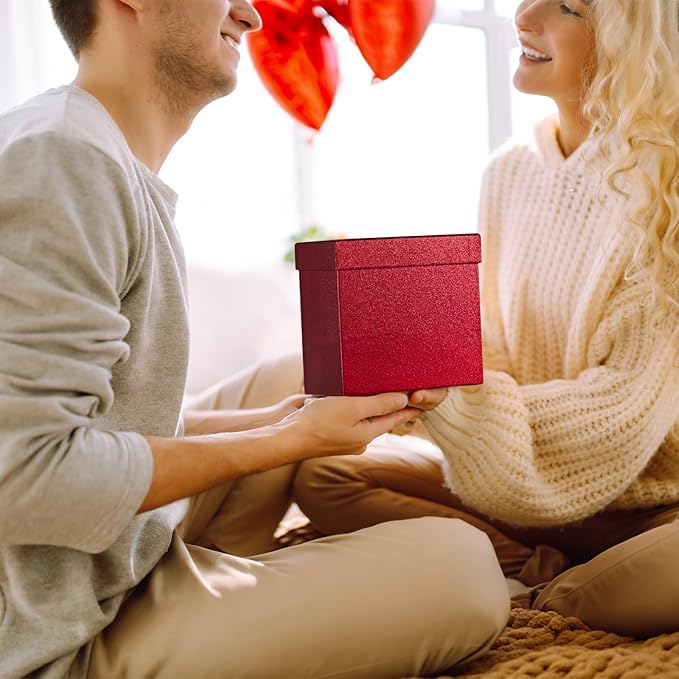 - MULTIPURPOSE STORAGE ORGANIZER BOXES. Set of 5. Foiled Red Glitter Finish, High shine, NO Shed. Square shape with lid, stackable nesting gift box tower. Size range from Xlarge to Xmall, 7.1'', 6.7'', 5.5'', 4.7'' and 4 Inch. Heavy-duty, 300g paper card stock boxes, great for any small to mediums gifts like books, candles, jewelry, cosmetics, small toys, home decor, apparel, scarf, and candies.