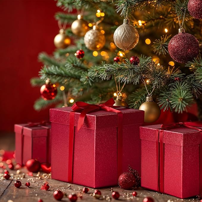 UNIQOOO 5Pcs Red Glitter Xmas Gift Box Set with Lid, Assorted Size, Square Nested Wedding Keepsake Boxes, Holiday Paper Box Tower For Birthday Party, Mother's Day Gift Wrap Packaging