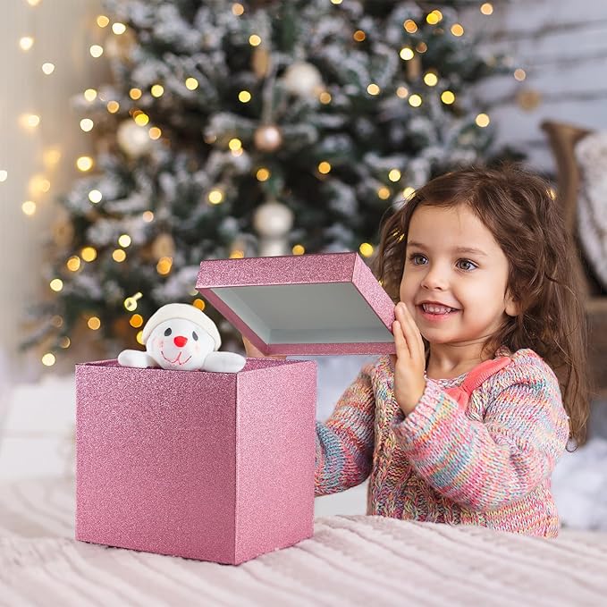 - MULTIPURPOSE STORAGE ORGANIZER BOXES. Set of 5. Foiled Rose Pink Glitter Finish, High shine, NO Shed. Square shape with lid, stackable nesting gift box tower. Size range from Xlarge to Xmall, 7.1'', 6.7'', 5.5'', 4.7'' and 4 Inch. Heavy-duty, 300g paper card stock boxes, great for any small to mediums gifts like books, candles, jewelry, cosmetics, small toys, home decor, apparel, scarf, and candies.