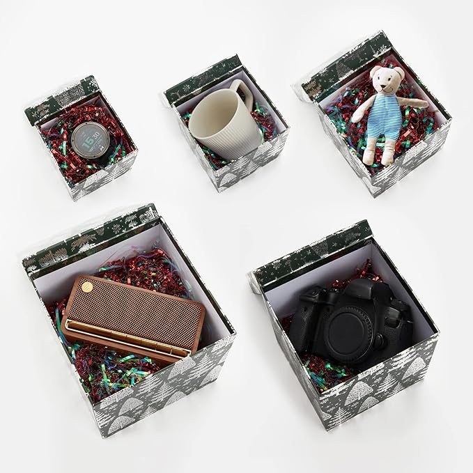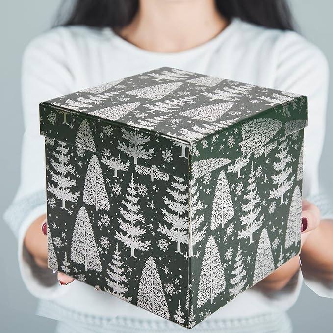- MULTIPURPOSE, DECORATIVE STORAGE BOXES ORGANIZER. Set of 5. Hunter green, foiled silver trees. Square shape, stackable nesting gift box tower, size range from Xlarg to Xmall, 7.1'', 6.7'', 5.5'', 4.7'' and 4 Inches. Silver foiled Xmas tree farm prints on trending hunter green background. Heavy-duty, 300g paper card stock boxes, great for any small to mediums gifts like books, candles, jewelry, cosmetics, small toys, home decor, apparel, scarf, and candies.
