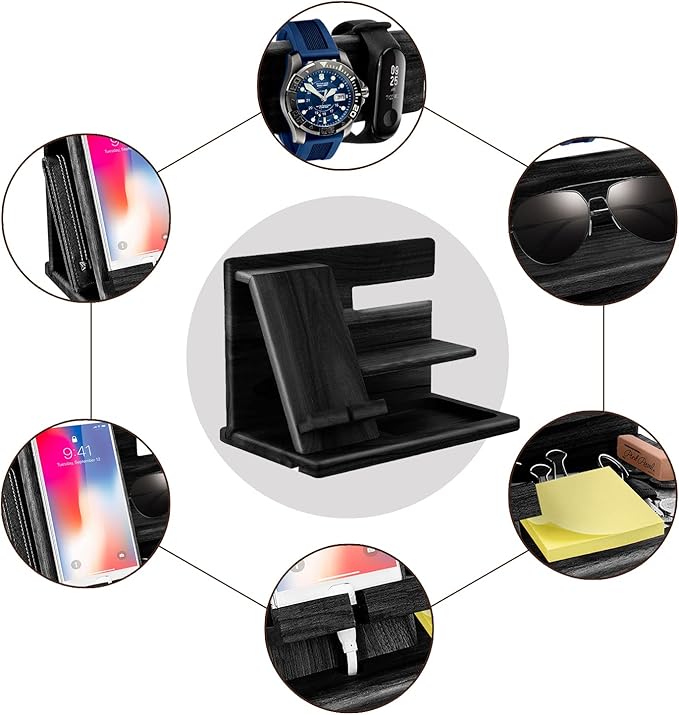 - Mens gifts for christmas multi-purpose design: Wooden phone docking station organizer can store your wallet, cell phone, keys, watch, glasses, fitness trackers, bracelets, etc. For organizing everyday carry items. It also fits on your desk or your bedside table, at home, office, or hotel.