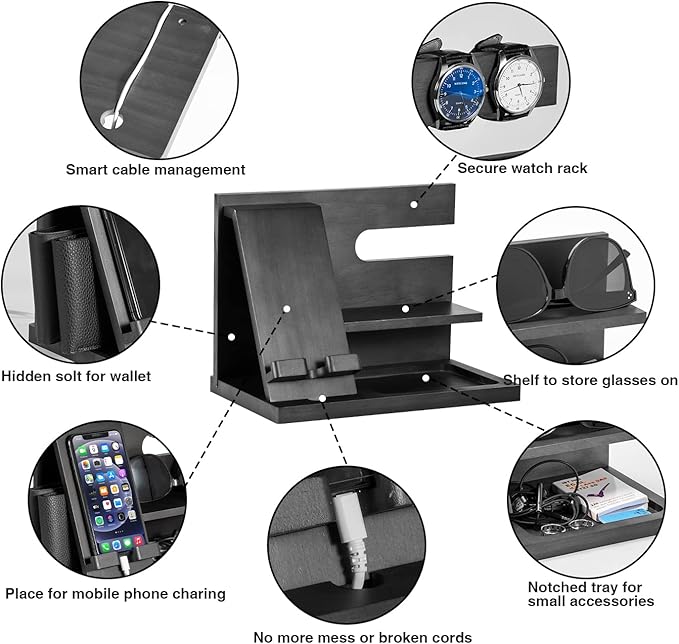 - Wooden Docking Station for Men - This Mens Organizer Stand let you keep messy wires out of the way, giving your phones and devices a designated space. This wooden docking station for men is compatible with all mobile phones, including any iPhone and Android phone. This phone station organizer let you tidy up your desks at home or in the office by organizing your trinkets and essentials such.