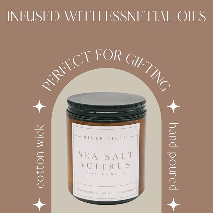 River Birch Candles Sea Salt & Citrus Scented Candle | Premium, All-Natural, Non-Toxic, Soy Amber Jar Candles | 8.5oz 40 Hr Burn Time | Cozy Relaxing Gifts for Home