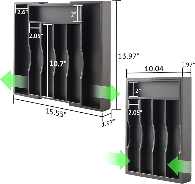 - [CLUTTER-FREE STORAGE]: Your expandable drawer organizer with 5-7 compartments serves not only as a cutlery organizer in drawer to store flatware and silverware like forks, knives and spoons, but also as a kitchen drawer organizer for large utensils like ladles, tongs and whisks. Keep all the kitchen gadgets in the right place and make the cooking hassle-free with your drawer organizer, so that you can save time and effort for fun things during the cooking.