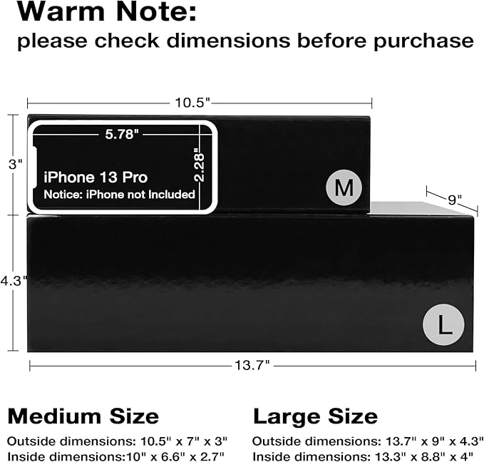 - Black Gift Boxes - boxes are shipped flat; medium black collapsible gift box with magnetic closure, assembled box outside dimensions 10.5 x 7 x 3 inch, inside dimension 10 x 6.6 x 2.8 inch.