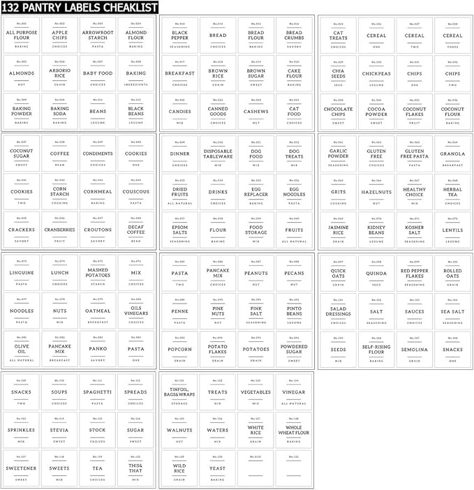 - 【PERFECT FOR PANTRY】132 Kitchen pantry labels for cookie jar to keep your food dry and pantry tidy. Minimalist labels are black text on white food labels stickers suitable for all airtight storage containers. Pantry decal organization labels are preprinted on premium vinyl stickers that won't tear or peel off but can easily be removed.