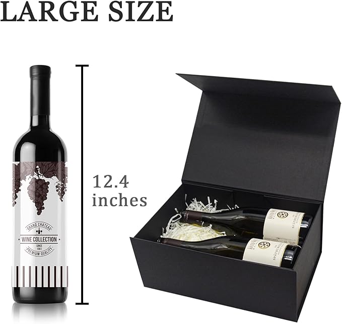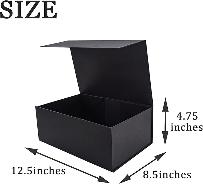 - Application: The Black gift box measures 12.5 x 8.5 x 4.75 inches, the perfect size for gifts like jewelry, souvenirs, perfumes, handmade items, wine, and more. Each gift box comes with a 95-inch silver ribbon, the bright ribbon makes the gift box look elegant and luxurious.