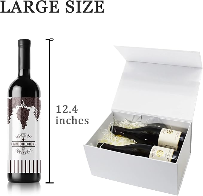 - Application: The white gift box measures 12.5 x 8.5 x 4.75 inches, the perfect size for gifts like jewelry, souvenirs, perfumes, handmade items, wine, and more. Each gift box comes with a 95-inch silver ribbon, the bright ribbon makes the gift box look elegant and luxurious.