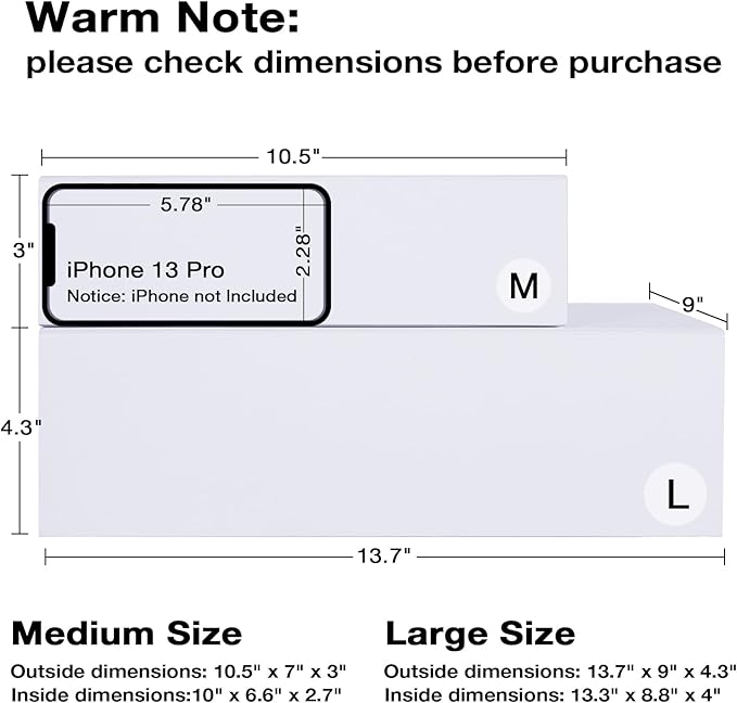 - White Gift Boxes - boxes are shipped flat; large white collapsible gift box with magnetic closure, assembled box outside dimensions 13.8 x 9 x 4.3 inch, inside dimension 12.5 x 8.66 x 4.13 inch.