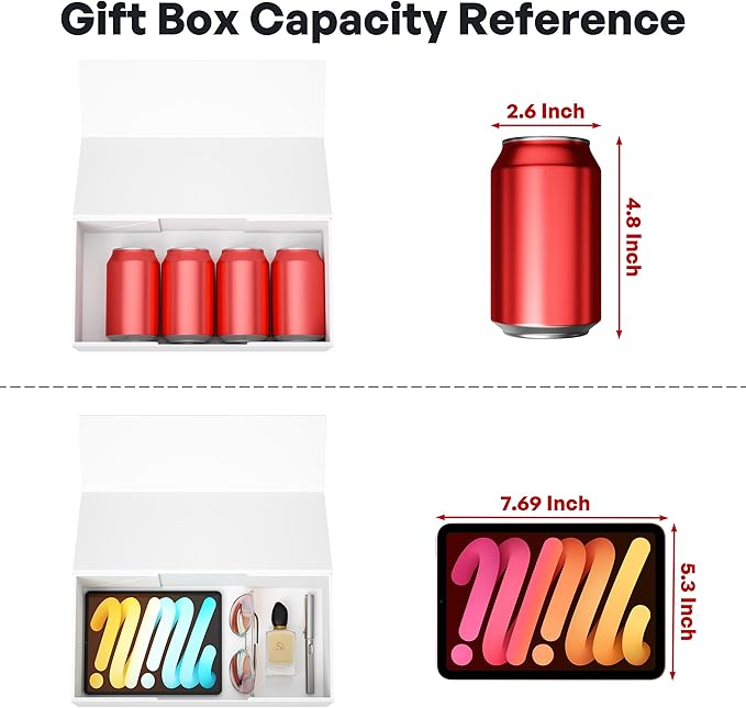 - 🎁SlZE - Gift boxes for presents External dimensiong 12x6x4 inches (Internaldimensions are 11.4x5.7x3.7 inches), Collapsible gift box can hold for iPad Mini 8.3 inch and Four cans of Coke, Electronic watches, sunglasses, belts, mobile phones, Lipstick, photos, toys, chocolates, candies, cosmetics, perfumes, jewelry, candles, cups, souvenirs orsmaller clothing accessories and more.(all dimensions are measured manuallywith deviation (range) at 0-0.2 inches)