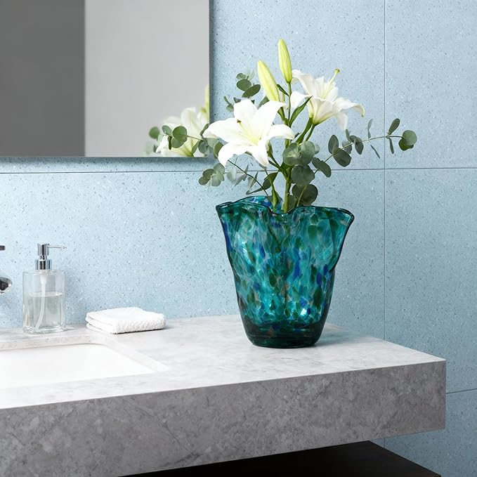 Hand-Blown Glass vase, Green Wide-Mouth Petal-Shaped vase, Modern Glass Art Decoration, Ideal for Living Rooms, Kitchens, Weddings, Dining Tables, and Office Centerpiece Floral Arrangements.