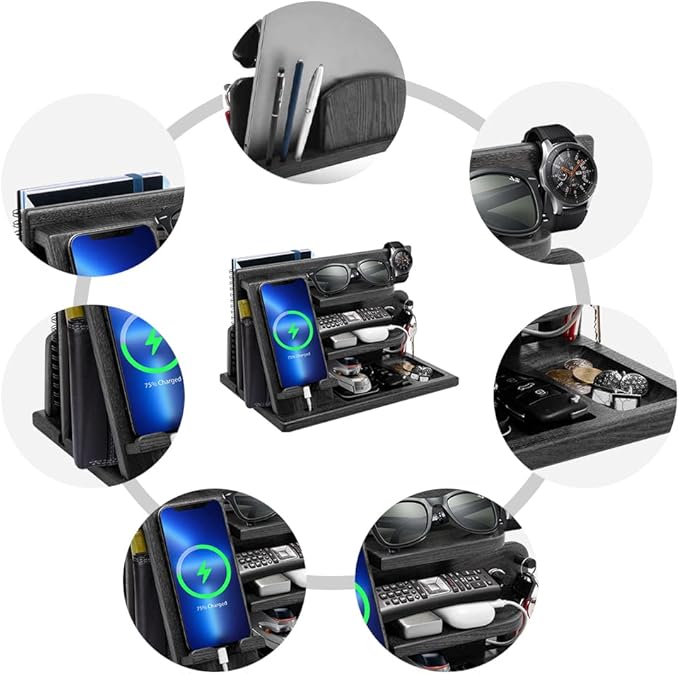 - Perfect docking station,christmas gift,charging station.Whether at home or in the office, keep all your daily essentials neatly and elegantly organized.It's a great solution for keeping all your everyday items organized and easy to find.Creative gifts for dad bedside organiser