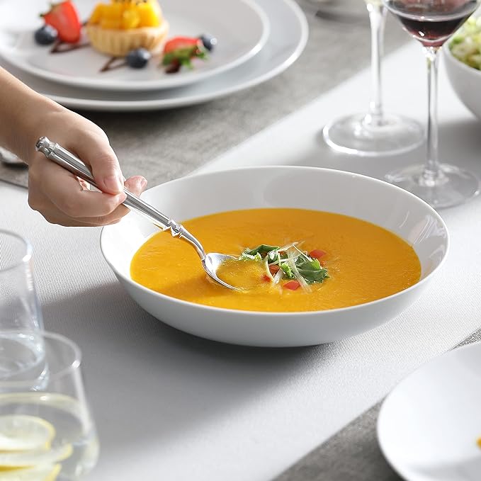 - 【WHAT'S IN THE BOX】MALACASA 24-Piece White Dinnerware Sets for 6 - Includes 10.5'' Dinner Plates, 8'' Dessert Plates, 40 oz Soup Plates, and 26 oz Bowls.