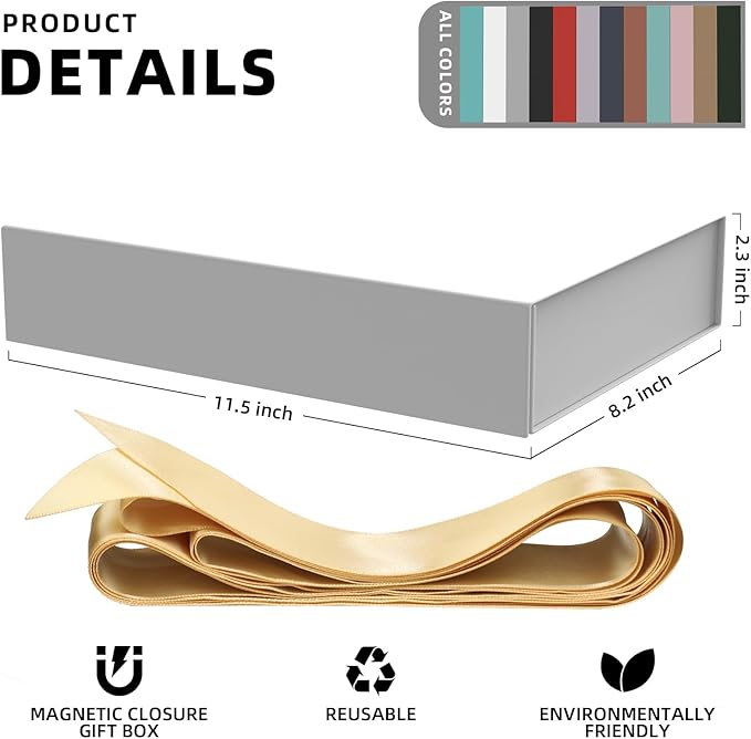 - HIGH QUALITY MATERIAL: Crafted from high-quality cardboard, our gift box features a sleek, glossy finish and a secure flip-top lid. Built to last, it ensures your gifts remain safe and stylish. Choose from a variety of colors and sizes to suit your gifting needs. (Includes a 1.5 x 10-inch champagne gold ribbon.)