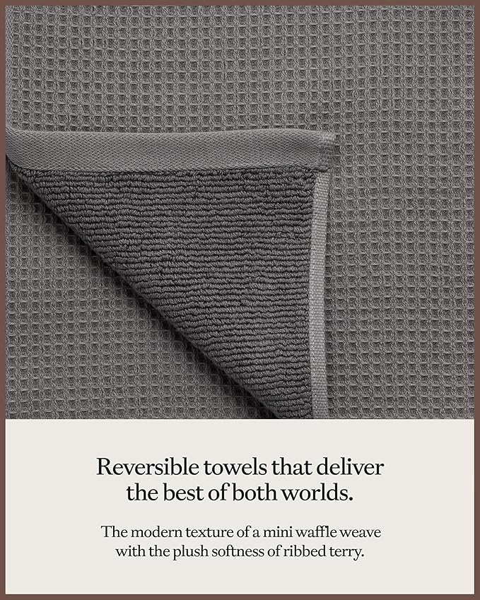 - MODERN TEXTURED DESIGN: Our waffle bath towels combine a mini waffle weave on one side with soft, ribbed terry on the other, bringing timeless style, plush texture, and superior drying power to your daily routine.