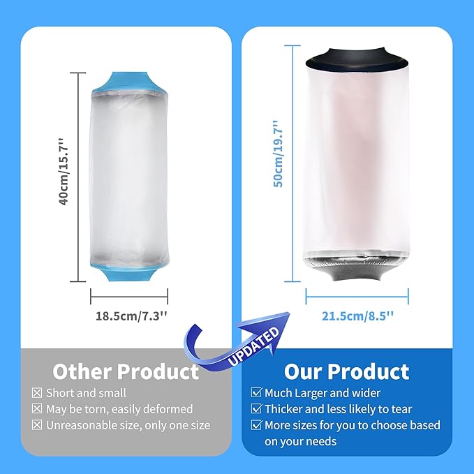 - Knee cast protector for shower with self-sealing protection. Soft and comfortable, no tightness and stuffy feeling. New M2 size, fits more need. Our knee shower cover length add to 50 cm now, long enough to cover your bandage. If you need longer one, please search on our shop, we provide 60 cm and 70 cm also.