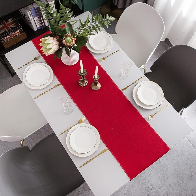 Christmas Table Runner with Fringe- 14x72 Inch Red, 100% Pure Linen Christmas Runner for Table, Red Table Runner for Winter – Machine Washable, Handmade