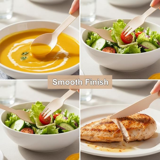 - COST EFFECTIVE SAFE PURCHASE: Our disposable wood cutlery serves as an essential gift for friends and family and anyone who loves high-quality disposable eco friendly utensils; We ensure that our wooden cutlery set will meet your expectations; If for any reason, it doesn’t, we offer returns without questions asked; If you have any issues with our wooden flatware set, contact us and we will ensure you have a positive experience while using our disposable biodegradable cutlery set.