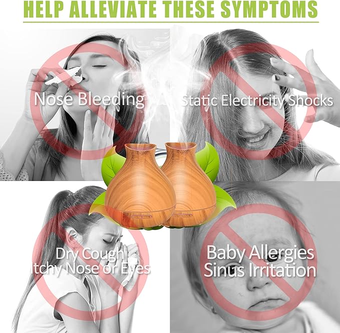 - Good Choice As Gift: This difusor is made from high-quality materials and features a sleek design ,a faux wood look that will complement any decor. It using advanced ultrasonic diffusion technology to atomize essential oils to help you breathe better. Especially during dry air, allergy season, and when you are sick, it helps you relax and sleep better, relieves allergies, and reduces the discomfort of dry skin. It's worth getting one for your family and friends.