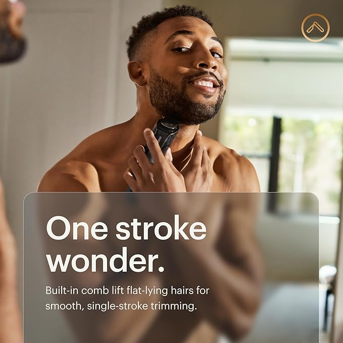 - ONE STROKE WONDER: our men's trimmer was designed with a unique cutting angle to have its built-in comb lift flat-lying hairs for smooth, single-stroke trimming.