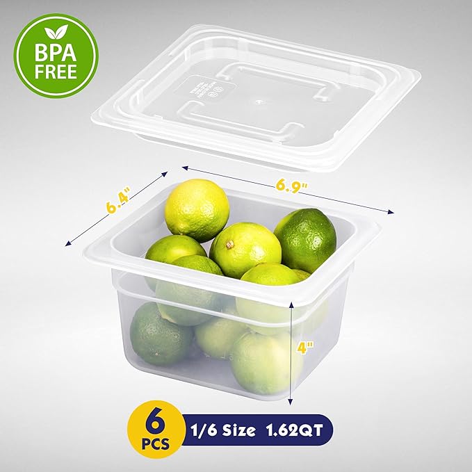 - 6-Pack Set: This set consists of six 1/6-size food pans with lids. These food pans measure 6.9"*6.4"*4" and have a capacity of 1.62 quarts, perfect for storing and preparing a variety of food in a limited kitchen space