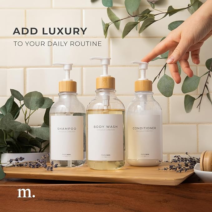 MaisoNovo Refillable Shampoo and Conditioner Bottles | 16.9 fl oz Set of 3 Clear Plastic Bottles White Bamboo Pumps