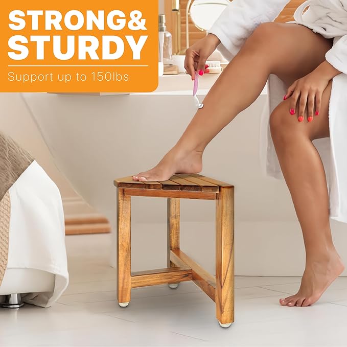 - [ZERO MAINTENANCE] Made with fade proof and durable proprietary, Our waterproof corner shower bench won't need applications of expensive teak oil or any maintenance, saving you time and money. Each leg of the shower foot rest for shaving legs is equipped with non-slip pads, which can make the product stable and not easy to slide on the ground with water