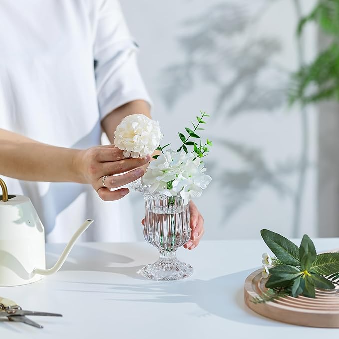 - Elegant Floral Goblet Vase: These glass flower vases is lovely with its delicate etched sides. 6" H x 4" D is perfect sized for adding an eclectic touch to the dining tables without creating huge floral arrangements. They are chic enough to appreciate on their own, and simultaneously highlight the unique beauty of your plants when paired with flowers.