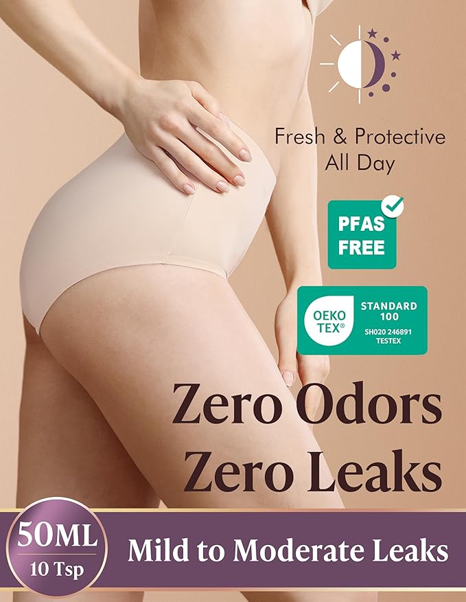 • PERFORMANCE, REGULAR UNDERWEAR LOOK: High Waist with AIRCUTE 3.0 Technology for double dryness and faster absorption. It looks and feels like your regular panties for light or moderate leakage(50ml, 1.76 oz), make you regain confidence, comfort and dignity. For heavy incontinence, night time or long time use, please try our other super absorbent leak proof panties with absorption of 120ML(4.2 oz)/150ML(5.29 oz)