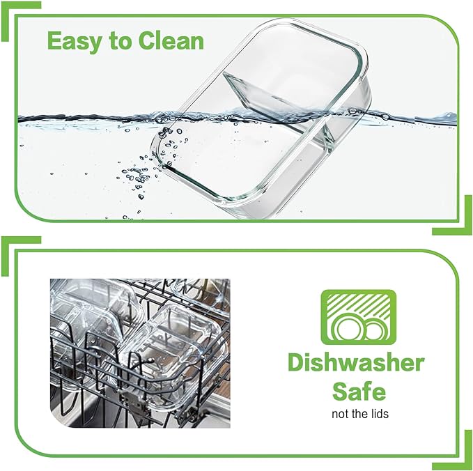 - [BPA Free & Easy to Clean] BPA-Free plastic locking lid is safe as well as leakproof. Crystal clear borosilicate glass is easy to clean without absorbing stains or smells. They are dishwasher safe to instead of hand washing. Also the silicone seal is removable for your to clean and dry it. In order to prevent seal sticking to the containers, please must wash the lids and containers before put them away