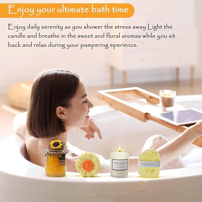 - [Stress Relief Spa Gift For Mom]: 7oz scented candle with the word"ONLY FOR YOU" fill the room with a soothing fragrance atmosphere, diamonds handmade soap bars made from pure plant floral fragrance, one Sunflower shaped bath salts and a bottle of rose scent sea salt, let her indulge in a deluxe floral bubble bath, self-care relaxation is so easy!