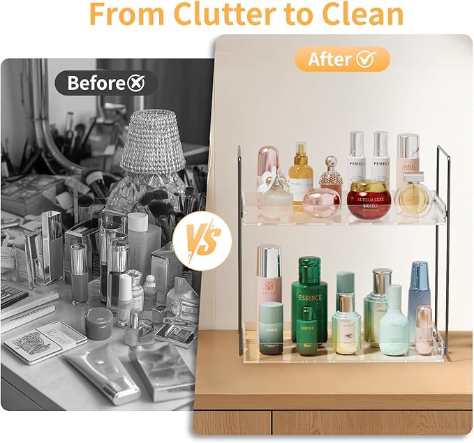 - OPEN AND CLASSIFIED STORAGE - This bathroom countertop organizer shelf is open, 2-tier design, no need to pull closed, different types of items are classified and stored in different tiers, all items are clear at a glance, no more confusing items.
