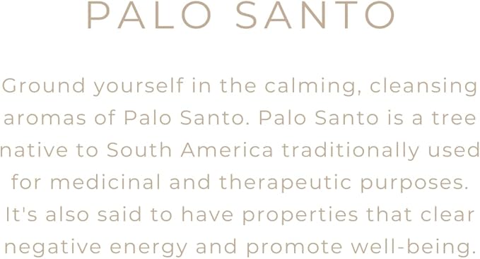 - THE SCENT: Ground yourself in the calming, cleansing aromas of Palo Santo. Palo Santo is a tree native to South America traditionally used for medicinal and therapeutic purposes. It’s also said to have properties that clear negative energy and promote well-being. This trendy, highly requested scent captures the clean woodiness of palo santo.