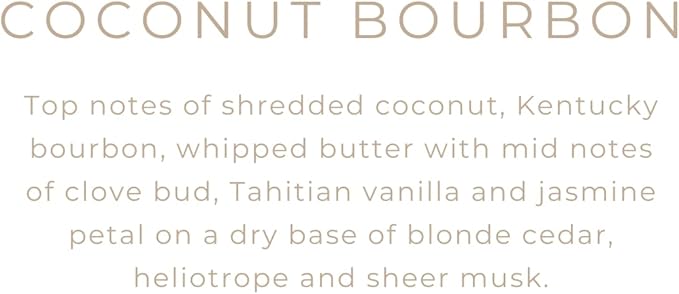 - THE SCENT: Top notes of shredded coconut, Kentucky bourbon, whipped butter, apple peel and peach skin with mid notes of clove bud, Tahitian vanilla and jasmine petal on a dry base of blonde cedar, heliotrope and sheer musk.