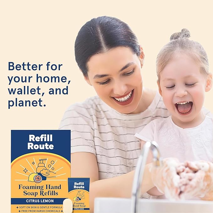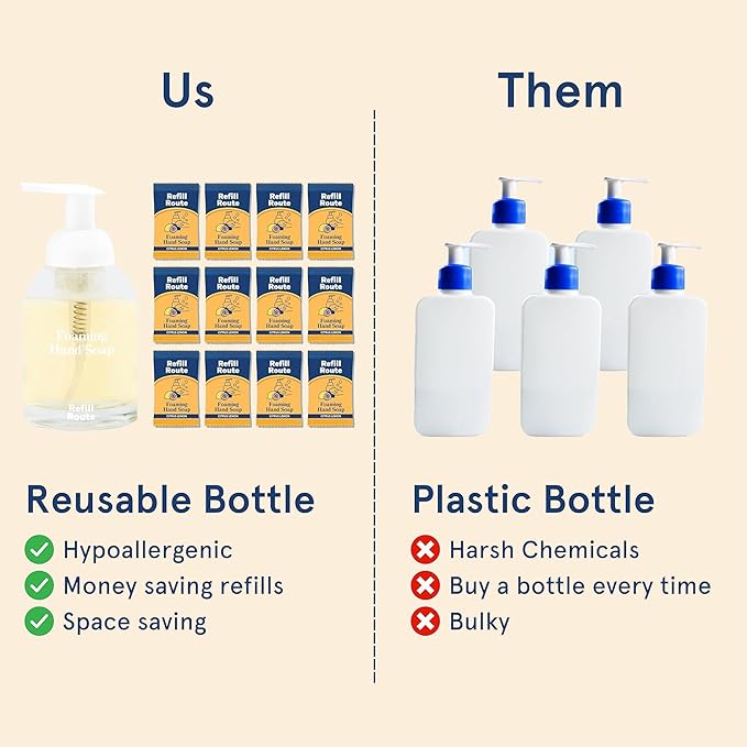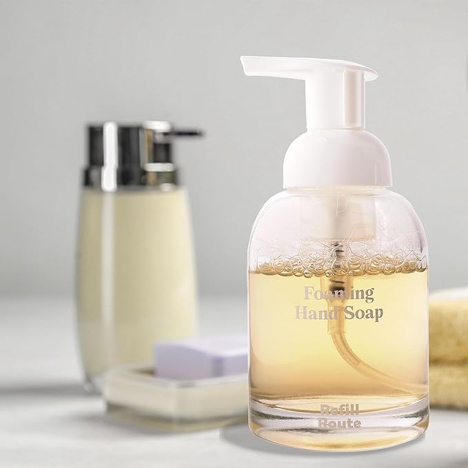 - Sustainable: Refill Route Foaming Hand Soap Duo Kit contains 12 hand soap tablets, 1 glass foam dispenser and 2 hand towels. Refillable and reusable. Purchase just once and use 100% no plastic tablets forever, which come in compostable paper packaging. No plastic bottles are needed.