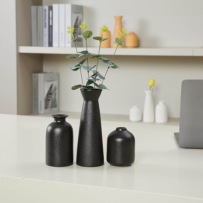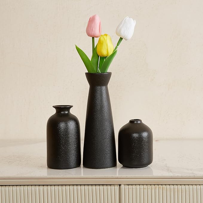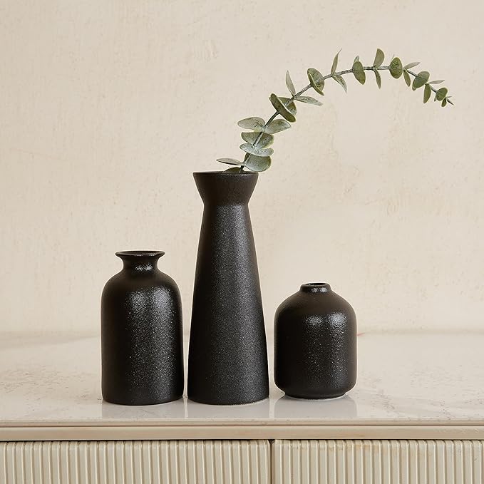 - 【Black Vases for Decor】 Elevate your home decor with this versatile set of three small black ceramic vases. Their sleek and modern design effortlessly enhances the ambiance of any space.