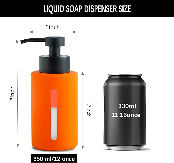 - Visual Capacity Design-Our orange soap dispenser boasts a transparent window for easy liquid level and dosage monitoring. The rubber-coated surface ensures a sleek, high-quality, and non-slip texture.