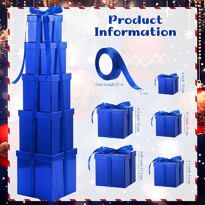 - Assorted Sizes for Versatility: with 5 different sizes ranging from 3.94 inches/ 10 cm, 4.72 inches/ 12 cm, 5.51 inches/ 14 cm, 6.3 inches/ 16 cm to 6.89 inches/ 17.5 cm, these nesting boxes are suitable for most items, making them a versatile option for gifting; Whether you need to wrap small jewelry items, snacks and candies or larger gifts such as clothing or books, they can accommodate your needs