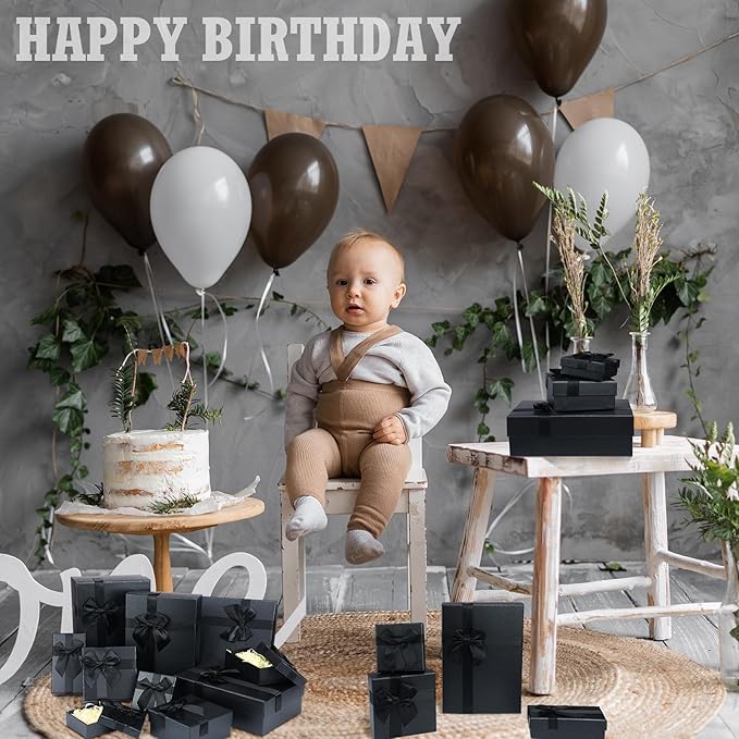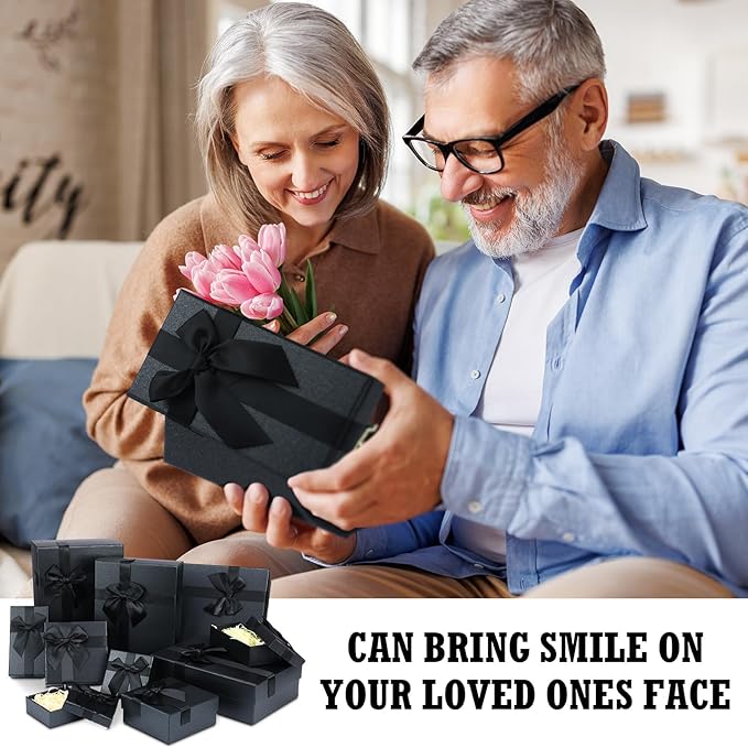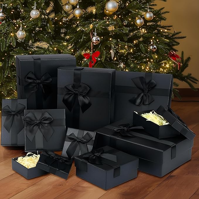 Tenceur 10 Pcs Gift Boxes with Lids Heavy Duty Nested Assorted Sizes Cardboard Gift Boxes for Presents with Ribbon for Xmas Holiday Present(Black,5 Size)