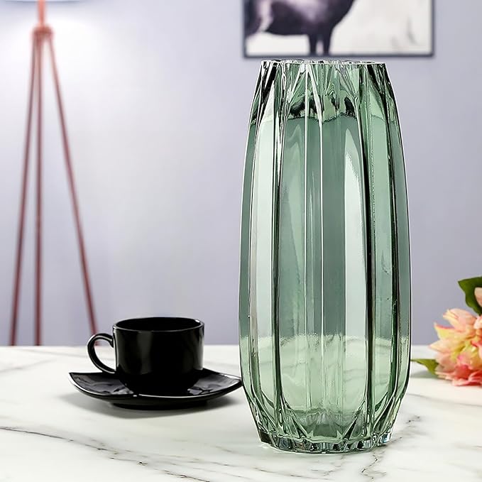 Green Ribbed Glass Vase - Modern Tall/Short Centerpiece for Flowers, Candles & Decor (H12.0inch)