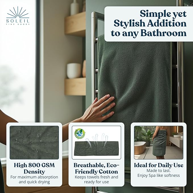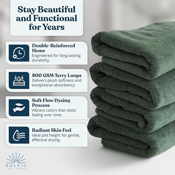 Soleil Fine Goods Luxurious 800 GSM 100% Cotton Bath Towel Set (4-Pack, 27x54) - Heavyweight & Ultra Absorbent, Plush Softness for Bathroom | Hotel & Spa Quality Luxury Towels- Forest